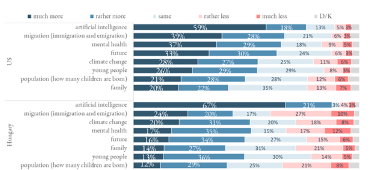 Despite the many differences, a degree of devaluation of AI is evident in both the American and Hungarian samples: only 37 per cent of Americans and 21 per cent of Hungarians aged 15 to 39 expressed a desire to engage more in discussions about artificial intelligence. In contrast, Hungarian respondents indicated strong interest in topics such as the future (70 per cent) and family (52 per cent), alongside mental health. Among Americans, climate change (50 per cent) and the future (46 per cent) were identified as the most important issues for further discussion.