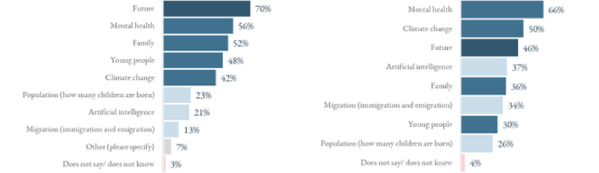 Among Americans, migration was the second most frequently mentioned topic (67 per cent), while Hungarians pointed to climate change and mental health (52 per cent each). These results reveal not only how seriously different issues are perceived, but also how attention is distributed across them. Perhaps most striking, however, is that despite the prominence of artificial intelligence in public discourse, it does not top the list of topics respondents believe should be discussed more. Of the eight topics surveyed, the highest percentage of agreement is recorded for mental health, which ranks first among Americans and second among Hungarian 15–39-year-olds.